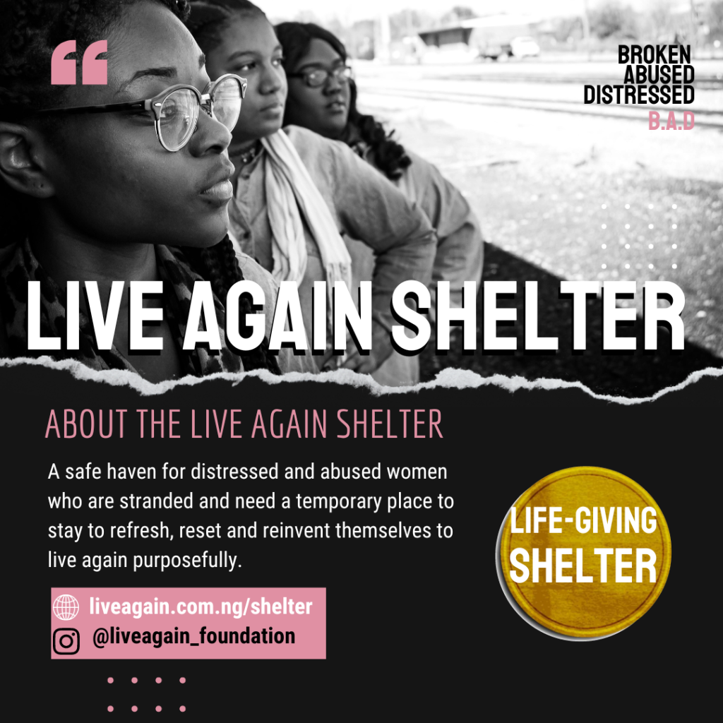The Live Again Shelter is a LIFE-GIVING shelter, place of healing and recovery for broken, abused and distressed women to help them heal, reset, refresh and bounce back stronger and better.