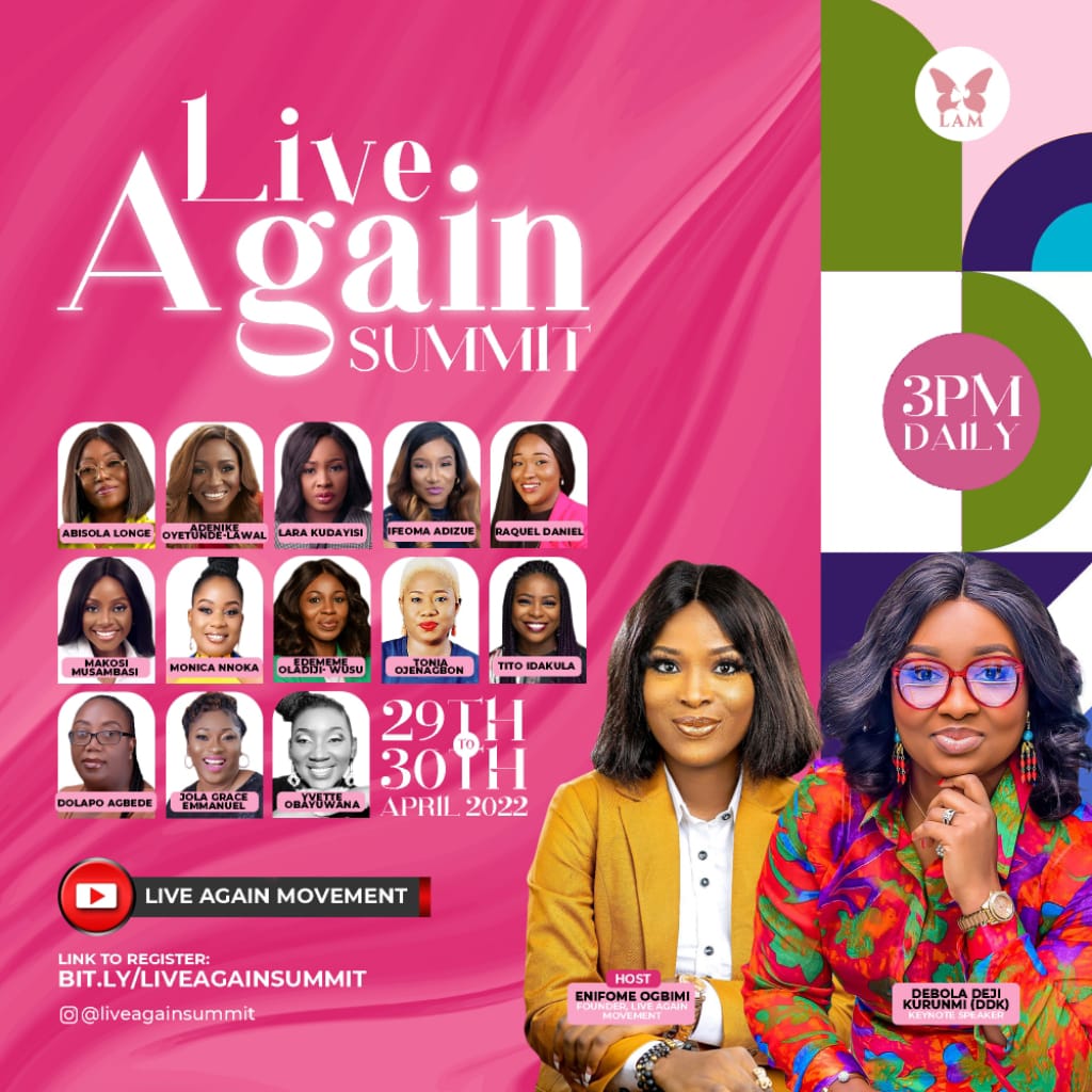 The Live Again Summit is a summit created to help women live again purposefully and profitably through the inspiring stories of women living again and practical steps they took to live again.